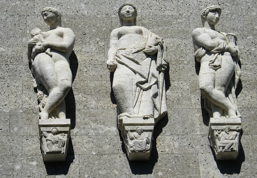 Tre statue sulla parete di un edificio nel centro di Milano.