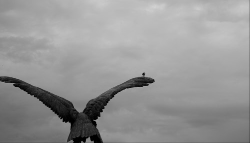 uccellino posato sull'ala d'un uccello di pietra