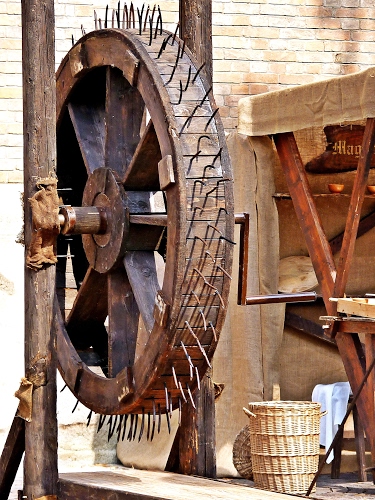 Altri tag (senza riscontro): ruote, travi, antico, mulino, perno, paglia, gesto, cerchio, strumento, mensole, ruggine, muro, pali, punte, vimini, ferro, cesti, assi, mattoni, rotonda, appuntito, tortura, cardatore.
