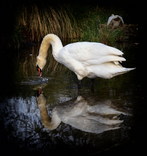 Trezzo cigno maschio e sullo sfondo la femmina che cova