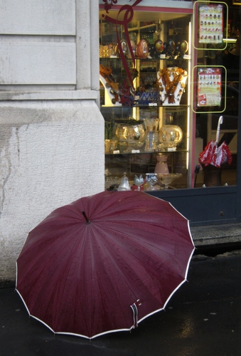 Ombrello parcheggiato sul marciapiede, davanti all'ingresso di un negozio in una strada di Milano.