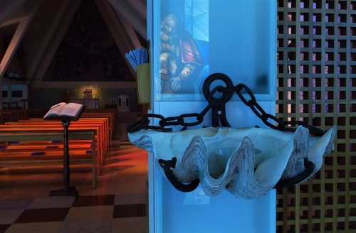 Grazie Donatella per il gradito commento e ti chiedo scusa ma solo adesso ho letto quanto mi hai scritto. Questa foto è stata scattata nella Chiesa Parrocchiale Santa Maria Assunta di Bibione dall'architettura moderna. L'acquasantiera che ho ripreso è situata entrando proprio davanti alla "Porta Santa" con immagine (si vede il riflesso) e lo sfondo blu, anche le altre porte di entrata sono in vetro decorate e con sfondo blu e celeste. La dominante azzurra è inevitabile soprattutto in giornate assolate. Le Cappelline laterali hanno anch'esse vetrate colorate gialle e rosse e questo ha permesso la varietà dei colori azzurro e arancione (zona banchi). Non si può proprio dire che questa chiesa non sia illuminata! Peccato invece che questa foto non sia stata abbastanza apprezzata, avrò sicuramente sbagliato qualcos'altro.