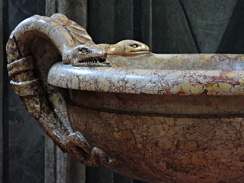 Acquasantiera barocca rappresentante la lotta tra il bene (l'acqua santa) ed il male (due serpenti). Santa Maria della Passione - Milano