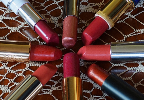 Non sono un'esperta di still life, ma credo che uno sfondo uniforme e chiaro, in contrasto coi rossetti, avrebbe reso di più. |