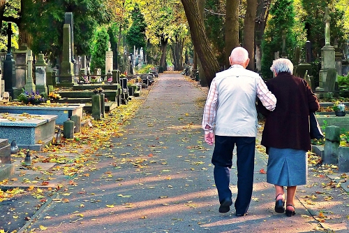 Tag: tombe, foglie, cimitero, alberi, anziani, coppia, viale, persone, vecchi, lapidi, due, camminare, autunno.