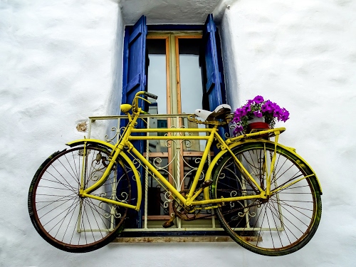Utilizzo alternativo di una bicicletta tra le strade di un'isola greca