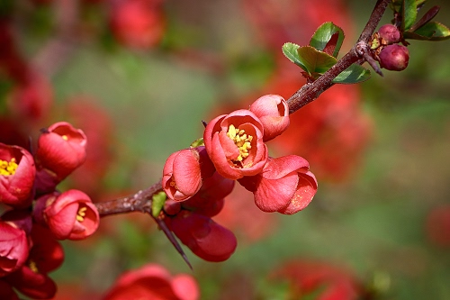 Tag: fiori, foglie, ramo, boccioli, rosso, sfocato, primavera, verde, giallo, fiore, pistilli, petali, rami, rossi, macro, rosa.