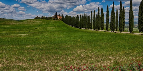 Tag: nuvole, cielo, alberi, cipressi, verde, strada, erba, azzurro, prato, colline, campagna, casa, panorama, case, filare, filari, paesaggio, cascina.