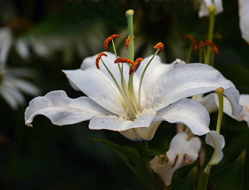 Tag: bianco, petali, fiore, pistilli, verde, stami, foglie, nero, giglio, macro, pistillo, arancione, sfondo, corolla.
