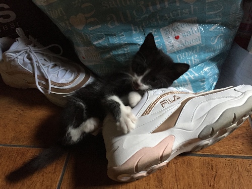 qui Leo era molto piccolo e cercava calore perchè trovato in un cassonetto ed allevato da mia figlia