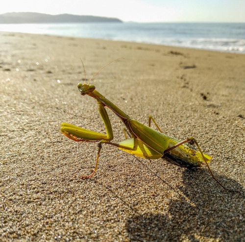 Una mantide prende il sole al mare