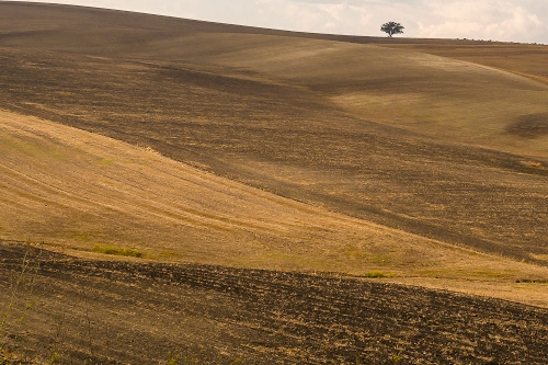 Tag: albero, terra, colline, campagna, paesaggio, campi, nuvole, cielo, giallo, verde, marrone, collina, panorama.