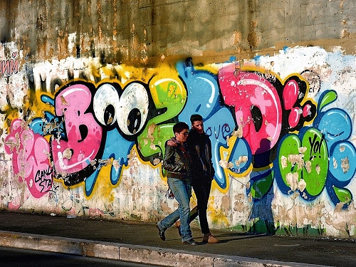 Altri tag (senza riscontro): marciapiedi, nero, rosso, fidanzati, disegno, giovani, strada, dipinto, passeggiare, ragazzi, giallo, celeste, lettere, scritta, ombre, astratto, parete.