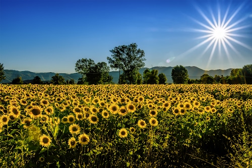 Tag: sole, girasoli, alberi, raggi, verde, giallo, campo, fiori, cielo, azzurro, piante, natura, petali, flora, estate.