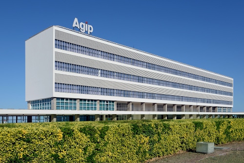 Tag: siepe, cielo, verde, azzurro, edificio, finestre, bianco, insegna, colonne, palazzo, vetrate, architettura, agip, scritta.