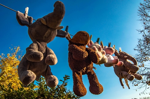 Tag: mollette, pupazzi, alberi, azzurro, cielo, appesi, filo, animali, giocattoli, peluche, elefante, foglie, peluches, bucato, verde, elefantino, asciugatura, stesi, elefanti, rami.