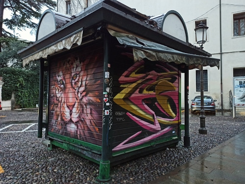 Altri tag (senza riscontro): siepe, casa, piante, serranda, chiosco, rosso, piazza, colori, strada, ciottolato, giornali, cielo, dipinta, selciato, rivendita, parcheggio, saracinesche, murale, chiuso, pioggia, edicole.