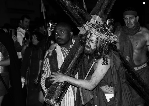 Tag: corona, croce, spine, cristo, persone, barba, legno, sangue, processione, braccio, passione, religione, bianconero, nero, tunica, bianco, crocifissione, rievocazione, calvario.