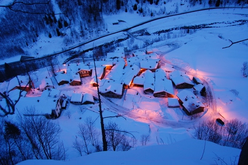 Tag: neve, luci, inverno, bianco, montagna, paese, panorama, sera, notturno.