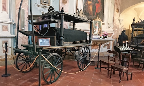 Due carri funebri posti in mostra in fondo alla chiesa, utilizzati a cavallo tra il XIX ed il XX secolo e classificati come carri di prima e seconda classe, con i relativi costi.