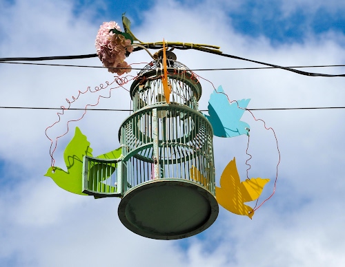 Tag: gabbia, uccelli, nuvole, fili, cielo, fiore, verde, giallo, sagome, azzurro, appeso, colori, carta, aperta, celeste, sportello, rosa.