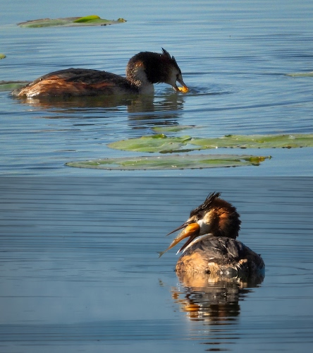 Uno svasso che ha appena pescato un pesce e lo sta inghiottendo.