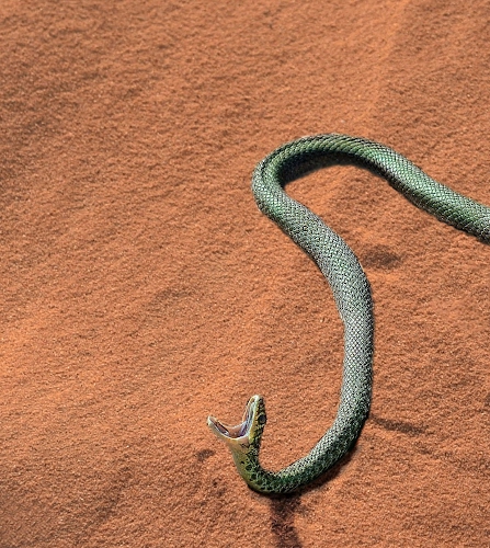 L'originale sarebbe questo: https://www.dizy.com/it/foto/1589296002 Allora, si nota subito l'assenza dell ombre, tranne la piccola ombra perpendicolare al corpo del serpente - nella foto originale si vede che l'ombra è più sinuosa e parte dall'ombra del corpo. Lungo alcune parti del serpente si nota lo scontorno fatto malissimo, con la dissolvenza di passaggio. E ci sono tracce delle pietre. E poi la cosa più ovvia, come è arrivato sto benedetto serpente sulla sabbia? Paracadutato dal cielo? Il serpente quando si muove sulla sabbia, lascia una caratteristica traccia (cercate su google "tracce serpenti sulla sabbia" se non l'avete presente) - della quale qui non c'è traccia. Vabbè. Dopo i piccioni vampiri che non si riflettevano nelle pozzanghere, abbiamo i serpenti senza ombra che non lasciano impronte. |