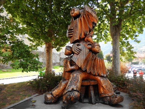 Scultura in legno "i fisarmonicisti" dell'artista locale Dorino Ouvrier in piazza porta Pretoria, accanto alla porta della città di epoca romana- Aosta