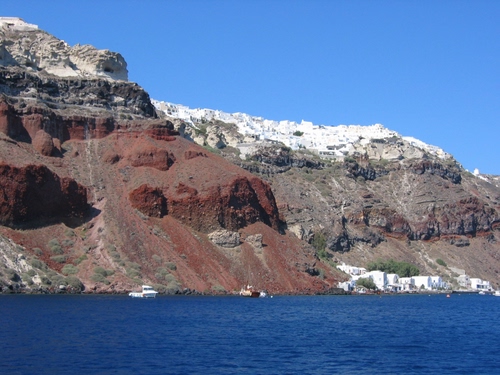 Rocce rosse e case bianche (in lontananza) sul mare blu di Santorini (Grecia).