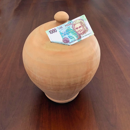 Tag: salvadanaio, lire, mille, terracotta, banconota, marrone, tavolo, risparmio, moneta, numeri, cartamoneta, soldi, carta.