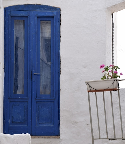 Tag: porta, fiori, bianco, blu, vaso, maniglia, uscio, vetri, casa, muro, legno, ringhiera, tende, soglia, azzurro, portone, fioriera.