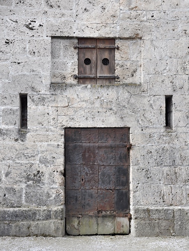 Tag: finestra, porta, muro, portone, feritoie, legno, ruggine, facciata, fori, pietra, casa, cardini, grigio, abbandono, ferro, cerchi, ante, due.