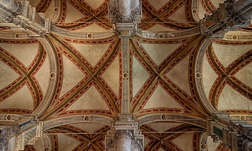 Tag: soffitto, archi, colonne, capitelli, geometrie, incroci, chiesa, volta, rosso, ics, marrone, giallo, interno, volte.