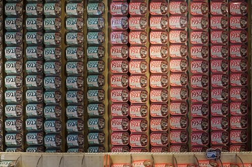 Un negozio che vende sardine in scatola. Hanno fatto scatole per ogni anno inserendo i fatti principali accaduti in quegli anni. Idea simpatica