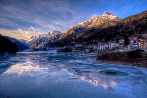 Tag: lago, montagna, montagne, panorama, ghiaccio, neve, riflessi, case, riflesso, inverno, nuvole, cielo.