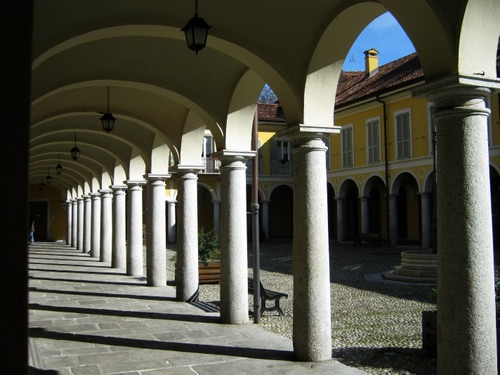 Il porticato su un fianco della bella Piazzetta Pedroni, a Pallanza (VB).