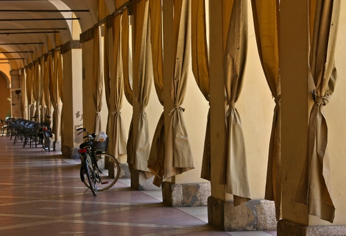 Tag: tende, biciclette, portico, colonne, bicicletta, porticato, portici, giallo, sedie, archi, prospettiva, tendaggi.