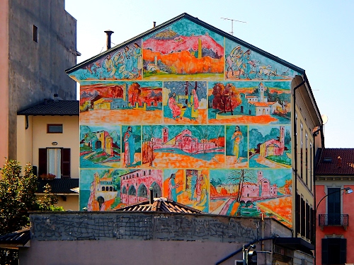 Tag: murales, casa, finestre, comignolo, cielo, facciata, antenna, lampione, tetto, balcone, palazzi, tetti, albero, muro, colori, parete.