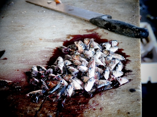 Sono stata attratta dal bancone di un pescivendolo per la' crudezza' della pulitura del pesce tra coltellaccio e sangue.