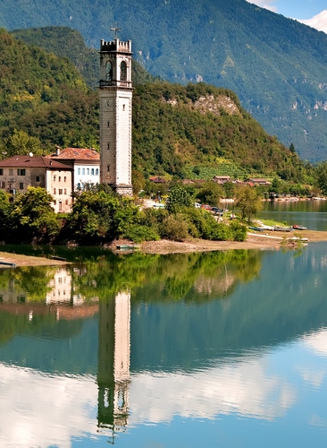 Tag: lago, riflesso, torre, acqua, montagna, montagne, campanile, alberi, riflessi, case.