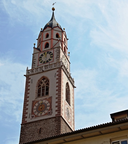 Merano, il campanile con due orologi per ogni lato