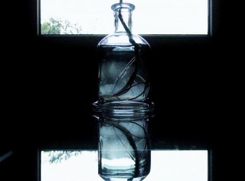 La piantina verde (è visibile la radice) si protende verso la luce del cielo oltre la finestra e si riflette sul tavolo di cristallo.