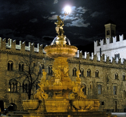 Tag: fontana, luna, merli, castello, finestre, nuvole, statue, notturno, notte, cielo, statua, trento, acqua, nettuno, albero, piazza, torre.