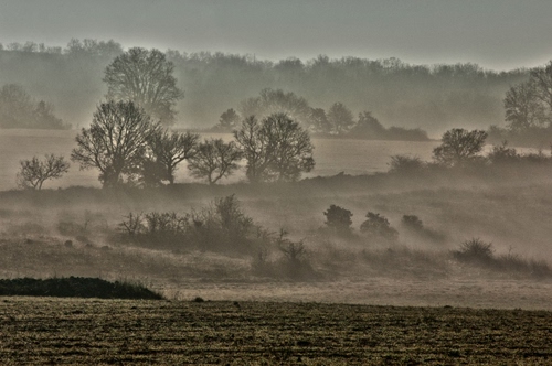 Tag: nebbia, alberi, campo, campagna, paesaggio, panorama, foschia, seppia.