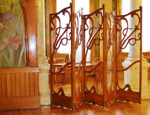 il paravento, disegnato da E: Basile, fa parte degli arredi lignei della Ducrot e si trova nel salone Basile di Villa Igiea (Palermo)