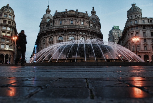 Tag: fontana, acqua, piazza, palazzi, genova, zampilli, luci, spruzzi.