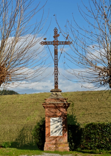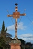 Tag: croce, rami, nuvole, alberi, ferro, metallo, cielo, prato, verde, lapide, piedistallo, monumento.