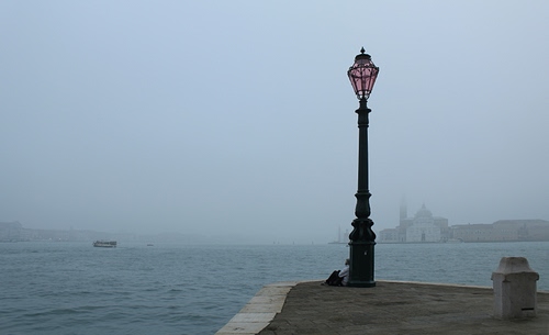 Tag: lampione, nebbia, mare, acqua, venezia, laguna, panorama, chiesa, molo.