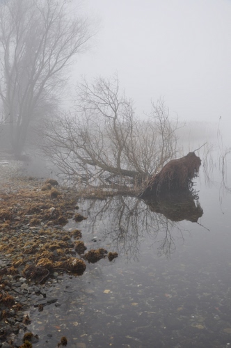 Tag: acqua, nebbia, rami, alberi, fiume, sassi, lago, radici, riva, albero, foschia, grigio, spogli, riflesso.