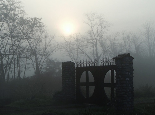 Tag: nebbia, cancello, alberi, sole, croci, controluce, pilastri.